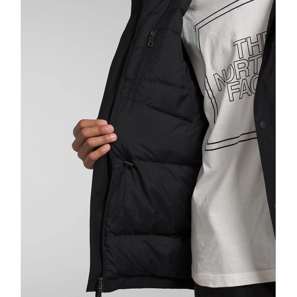- Stormflap with a snap closure covers the two-way center front zip